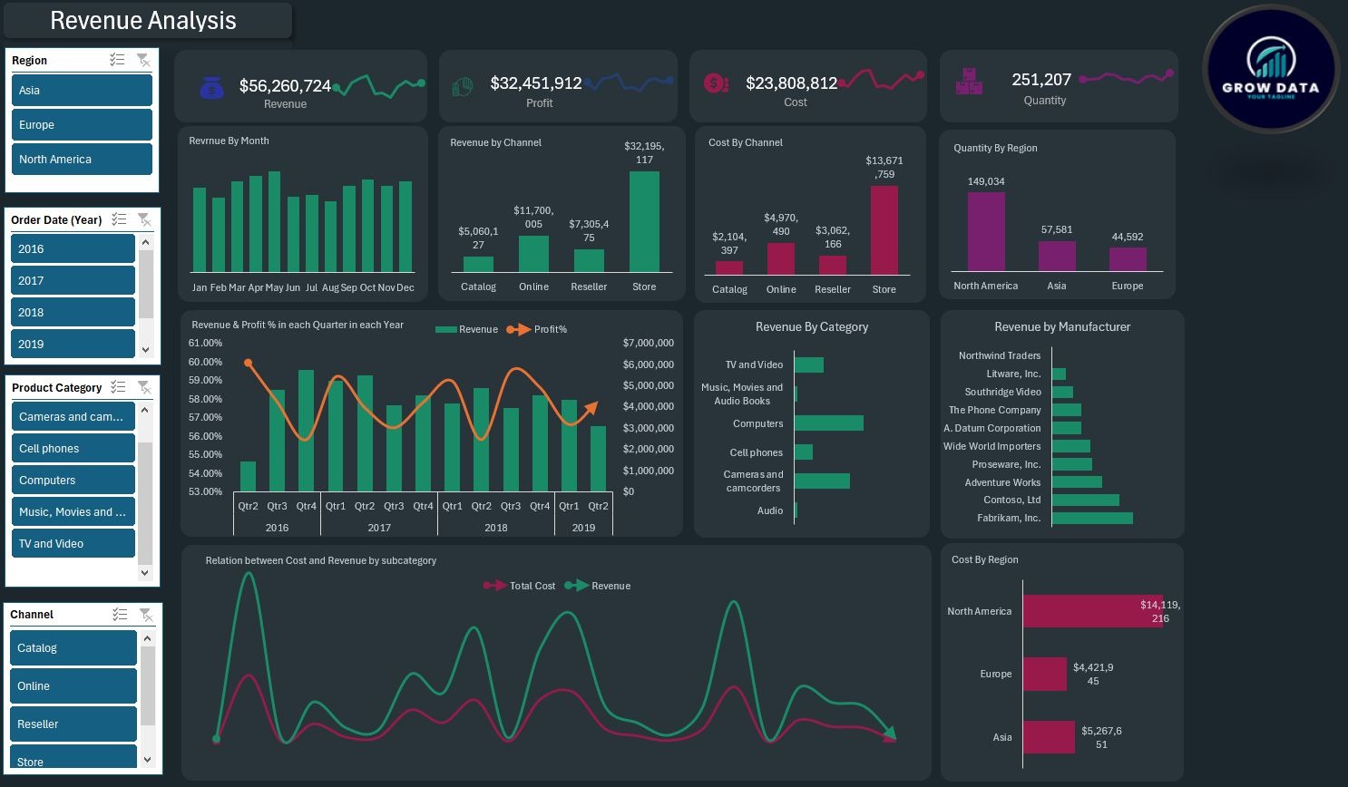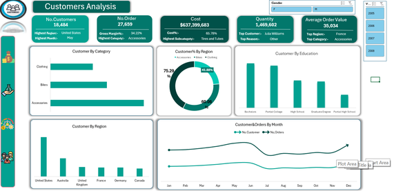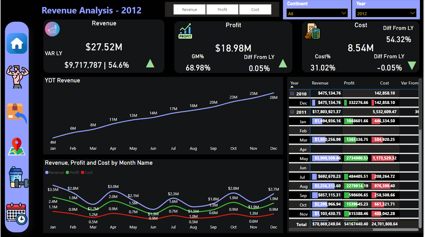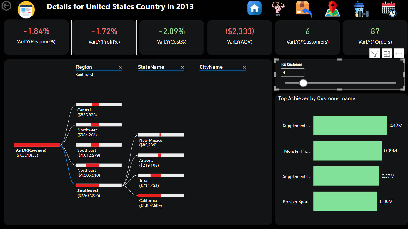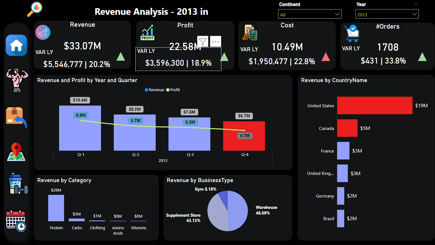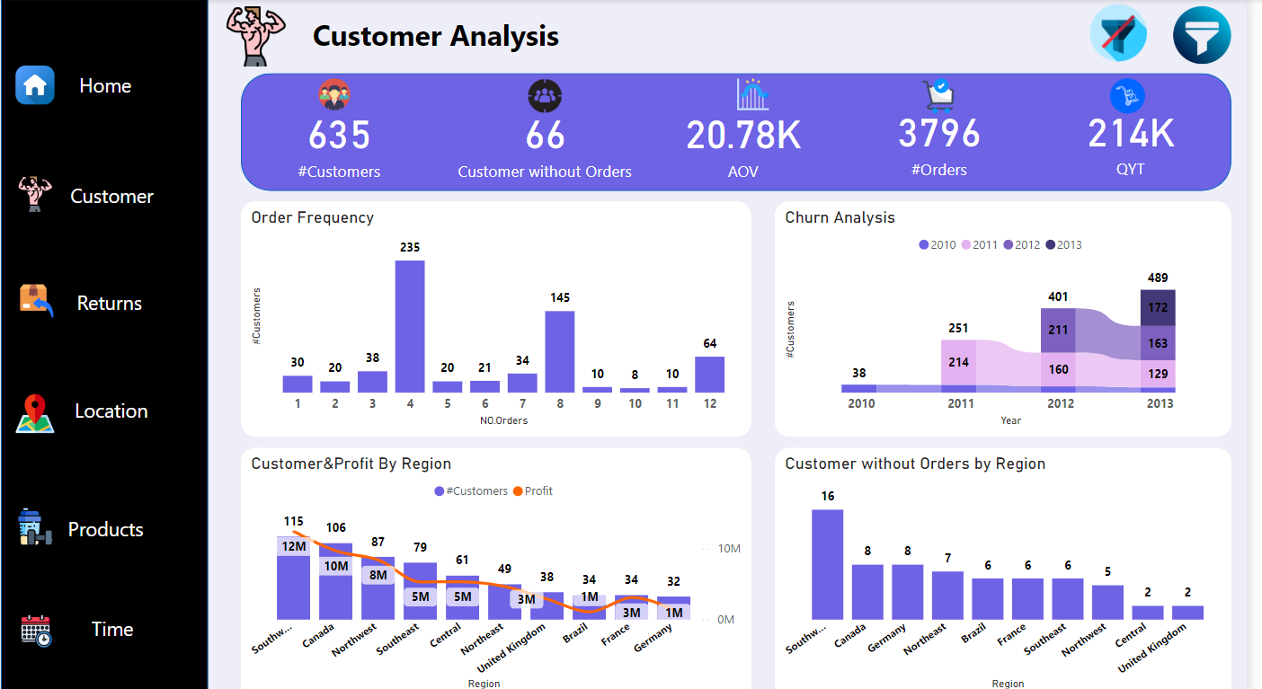 - Custom DAX Calculations: Developed DAX measures to calculate crucial KPIs like revenue, profit, customer count, and order quantities for deeper business insights.