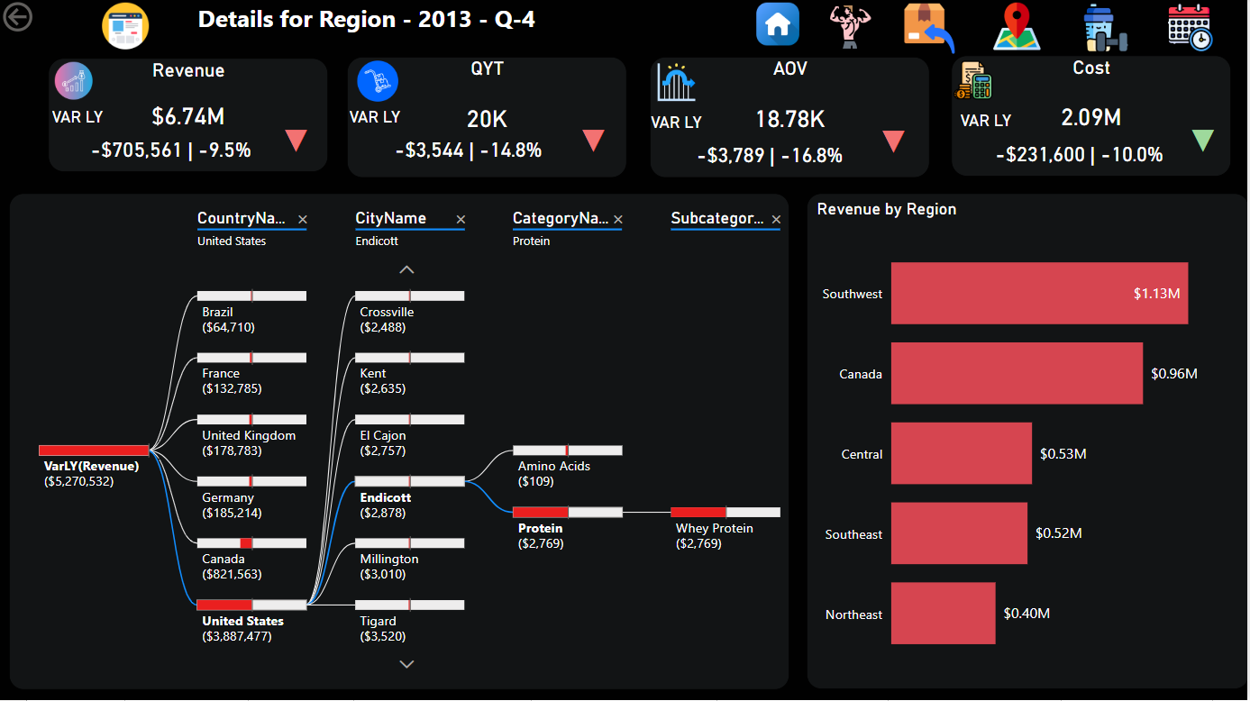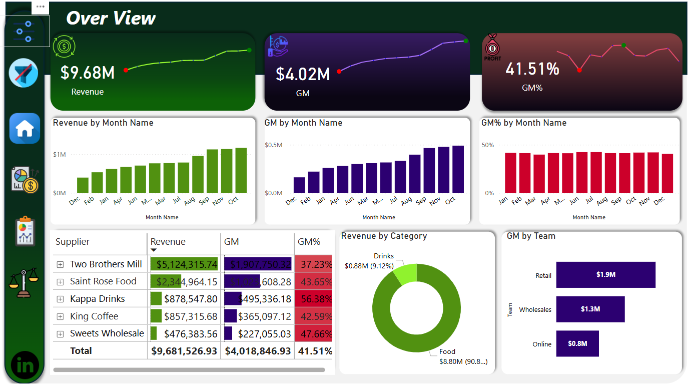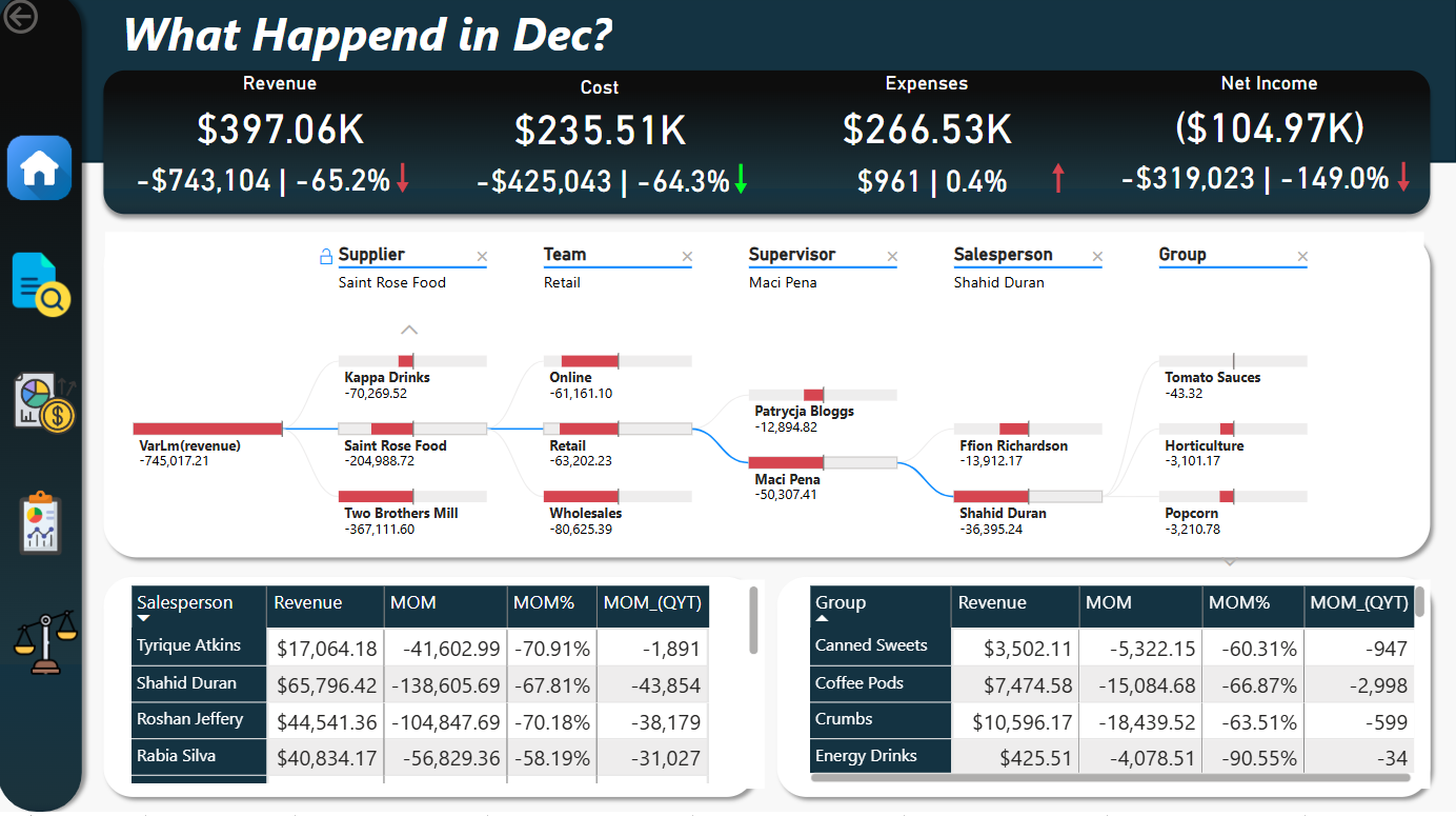 Created an interactive dashboard displaying key KPIs and sales trends, with dynamic filters to drill into data by location, time, and product categories.